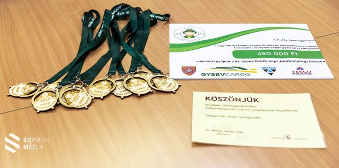 Hatodik alkalommal szervezte meg a Paddy Sportegyesület Szent Patrik-napi jótékonyági futóversenyét. A rendezvényen közel 350-en vettek részt. Idén a nevezési díjakból befolyt összegből a kórház Csecsemő- és Gyermekgyógyászati Osztályának „Aranytallér Gyermekeinkért Alapítványát” támogatták. Az adományt csütörtökön adták át a sportegyesület képviselői a kórházban dr. Tóth Gergely osztályvezető főorvosnak, aki elmondta, az összeget, az eddig már megvalósult gyűjtésekhez hozzátéve, szűrővizsgálatokra fordítják. 500 soproni óvodást fognak megszűrni a lisztérzékenységre, amely hatéves korra kialakulhat hajlamosság esetén. A kiszűrt gyermekek kezelését el is tudják indítani, megelőzve betegség komolyabbra fordulását.