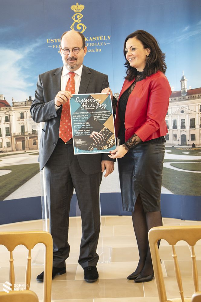 Egresitsné Firtl Katalin az Eszterháza Kulturális, Kutató-és Fesztiválközpont ügyvezetője és Rácz Márton művészeti vezető közösen jelentették be az Eszterháza Meets Jazz őszi koncertsorozatot a szerdai sajtótájékoztatón.