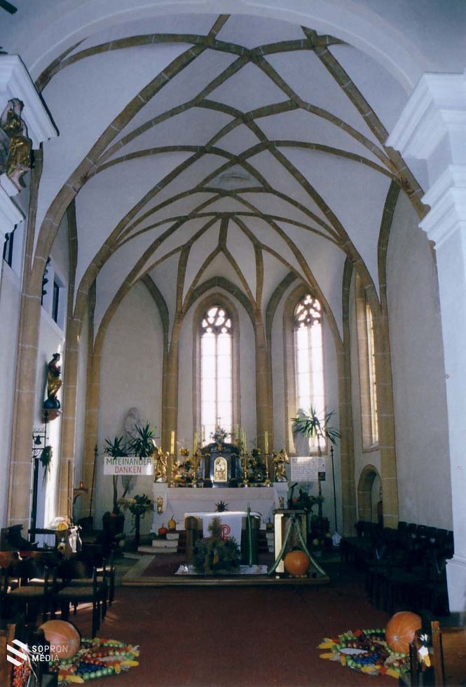 Az orgonakarzat toszkán oszlopokon nyugvó keresztboltozaton ül. A mai orgona a soproni König orgonakészítő műhelyben munkája 1850 körülről. A hajótól széles diadalívvel elválasztott szentélyt gótikus hálóboltozat fedi. A szentély falán festett keretben lévő1947-es falkép másolat Dürer Mária élete című képéről. Az oszlopos kialakítású főoltár barokk. A szabadon álló szentségtartó őrzi a Fekete Madonna kegyképet. A főoltár késő barokk kőszobrai Szent Józsefet és Tádét ábrázolják.