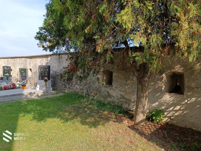 A templom körül a régi erődfalakon belül ott a község temetője. A mellette szép, virágos környezetben emelkedő Szenvedő Krisztus szobra 1628-ban készült, Lók egyik legértékesebb műemléke. Rajta Pilátus szavai: Ecce homo - Íme az ember. Felirata nem a talapzaton, hanem az oszlopfőn olvasható. A megostorozott, ruháitól megfosztott Krisztus egy kövön ül, keze megkötözve, fején töviskoszorú. Az oszlop szőlőfürtökkel, indákkal díszített, korinthoszi fejezetű. Az állíttatás éve: 1688.