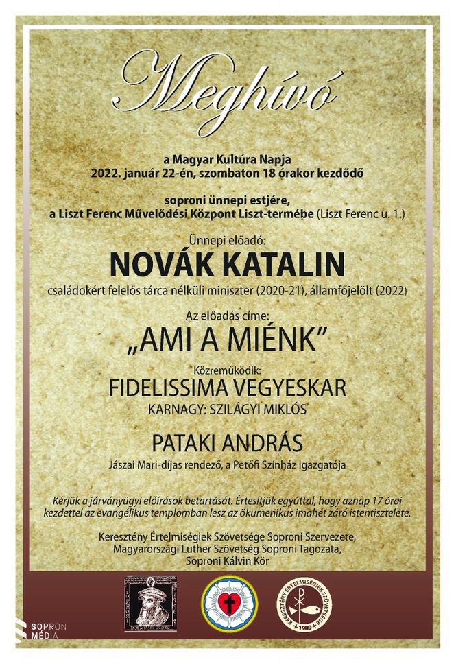 A családokért felelős miniszter, köztársaságielnök-jelölt a Magyar Kultúra Napja alkalmából tart előadást a Liszt Ferenc Konferencia- és Kulturális Központban január 22-én, 18 órától.