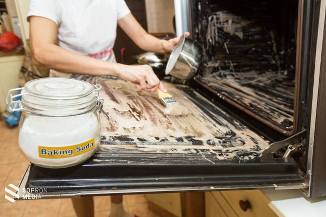 Szórjunk ki szódabikarbónát a sütő aljára! Aztán szórófejes locsolóval fújkálva nedvesítsük be a szódabikarbónát! Hagyjuk egy éjszakát állni, reggel még dörzsölük át, majd szedjük össze a szódabikarbónát, szivaccsal pucoljuk ki a maradékot, és öblítsük le!