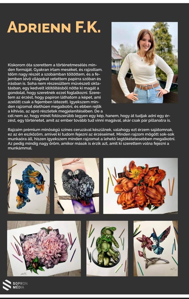 A Soproni Petőfi Színház épülete ad otthont annak a csodálatos kiállításnak, mely a Színek és részletek címet kapta. Adrienn F. K. soproni művész képei színes ceruzával készülnek, amit első ránézésre nem mondanánk meg, hisz annyira részletgazdagok, hogy már-már fotóminőségben készülnek.