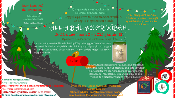 Saját készítésű dekorációk és egy varázslatos mesevilág várja a kilátogatókat. „Az erdő lakói hetek óta a karácsonyi bál előkészületeivel vannak elfoglalva, ám most veszélybe került az esemény. A bál megmentéséhez a túrázók segítségére is szükségük van.”