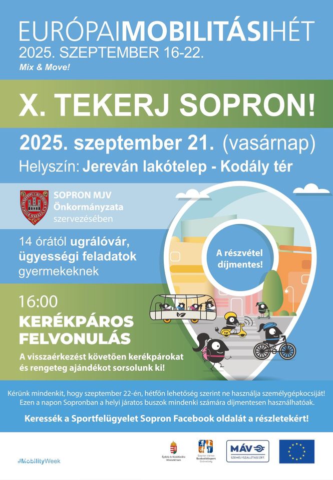 Az Európai Mobilitási Hét keretein belül – amelynek célja, a környezetbarát és fenntartható városi közlekedés népszerűsítése – tizedik alkalommal szervezi meg Sopron MJV Önkormányzata a Tekerj Sopron! című eseményt szeptember 21-én. A részvétel díjmentes.