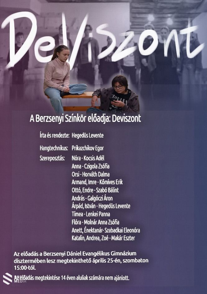 - mondta el az előzményeket Levente. Elárulta, kért és kapott tanácsokat, segítséget felnőttektől és fiataloktól egyaránt, ugyanakkor számára a darab elsősorban arra a nagy önismereti kérdésre ad választ, amit három éve fogalmazott meg magának: képes vagyok rá? Most már tudja, igen, megcsinálta, és meg is mutatja. Április 25-én, szombaton, 15 órakor, a Berzsenyi Dániel Evangélikus (Líceum) Gimnázium Dísztermében bemutatják a Deviszont című darabot. Az előadás nyitott és ingyenes, viszont az érzékeny témák miatt 14 éven aluliak számára a szerző nem ajánlja.