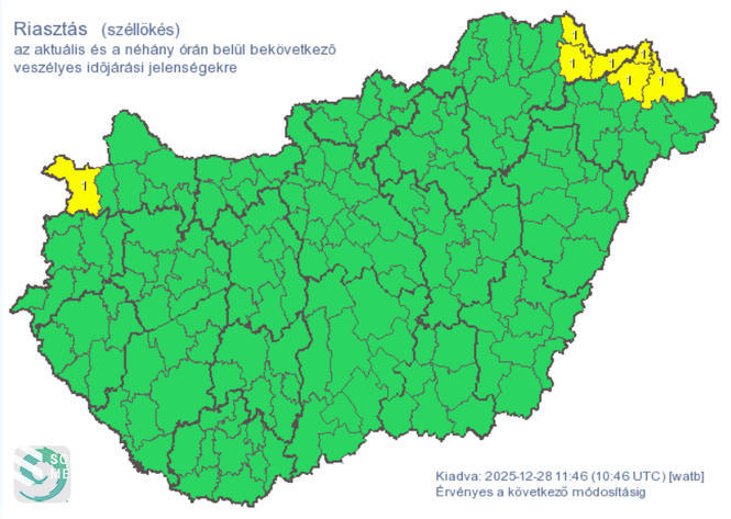 Ma napközben északkeleten, illetve főként a Dunántúl magasabban fekvő részein az északnyugati szelet időnként viharos (>70 km/h) széllökések kísérhetik. A hegyvidékek magasabb térszínein 80 km/h feletti széllökések is előfordulhatnak. Estére fokozatosan veszít erejéből a légmozgás.