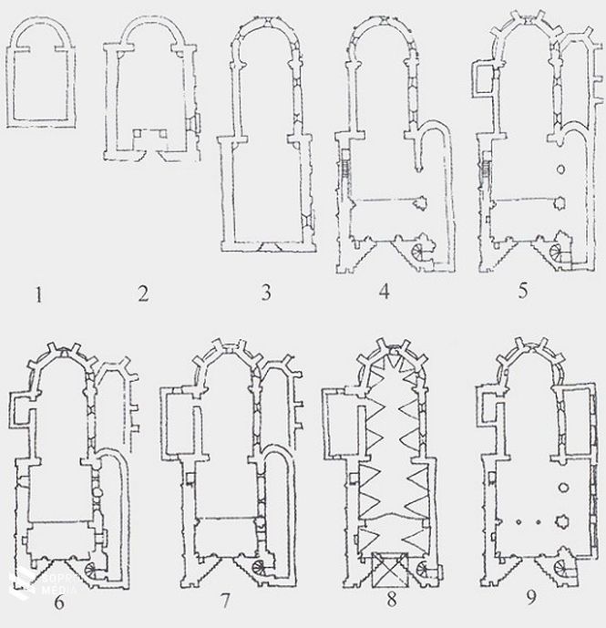 Dümmerling Ödön szerint a templom kilenc alakváltozáson (újjáépítés, bővítés) ment keresztül, a kilenc alaprajz a templom külső falán megtekinthető. Az első − 11 m hosszú és 7,5 m széles − kis templom kb. 1200-ig állt, amikor vagy elpusztult, vagy az alapító temetkezési helynek jelölte ki, és tőle nyugatra újat építtetett. A második templomot 1200 körül emelhették, és körülbelül 25 évig állt. A 13. század első negyedében kibővítették az épületet a mai hosszúságú szentéllyel (24,5 m), a jelenlegi főfalak is ebből az időszakból valók. Sík mennyezetű ekkor a hajó, apszisát negyedgömb-kupola fedhette, néhány évig maradt így.