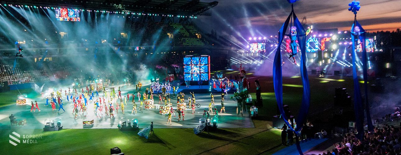 Az ETO Parkban rendezett ünnepség elején felhangzott Grósz Arthur Valentin nyitánya a Győri Filharmonikus Zenekartól. A show első felében fellépett többek között a világbajnok ugrókötelező Bánhegyi Adrienn, a Vaskakas Bábszínház, a Győri Balett és a Győri Nemzeti Színház tánckara, valamint artisták, táncosok, és extrém sportolók. Összesen több mint háromszázan gondoskodtak a helyszínre kilátogatók és a Duna World nézőinek szórakoztatásáról. A látványhoz egy hatszor hat méteres LED-kocka, valamint a nézőknek kiosztott, speciális, világító és villogó karkötők is hozzájárultak.