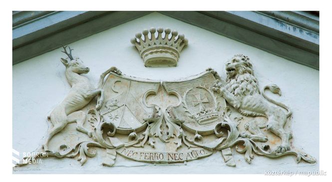 A műemléki védelem alatt álló palota homlokzatán az egyesített címer látható a Zichy-Meskó családok címerállataival, címerpajzsokkal. Fölöttük kilenc ágú korona. A címerben latin felirat: „NEC FERRO, NEC AURO”, azaz „Sem fegyverrel, sem arannyal”.