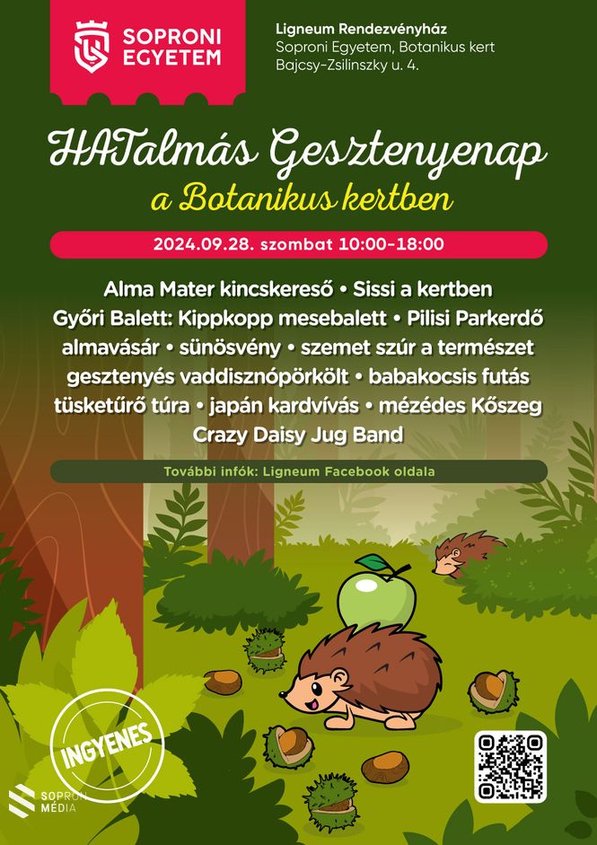 Vendég lesz a közeli Kőszeg, a mesebeli kisváros, ahonnan mesebeli mézeskalácsok érkeznek a népmese napja tiszteletére. Műsorral készülnek a Hunyadi AMI kis zenészei, az egyetemi Ürmös Tánckör és ebédidőben a legendás selmeci diáknóták is felcsendülnek majd. A Pilisi Parkerdő is beköltözik a Botanikus Kertbe, a nemrégiben újjáépített Erzsébet-forrásnál pedig maga Sissi mint a természet és az állatok rajongója is életre kel. És persze lesz almavásár, kipróbálhatjuk a futó babakocsit, fűrészelhetünk rönköt, barkácsolhatunk, festhetünk, kóstolhatunk és még táncolhatunk is. A Botanikus Kert 10:00-18:00 óra között kínál látni-, tanulni- és játszanivalót. A napot a Crazy Daisy Jug Band koncertje zárja a Ligneumban 18:00 órától.