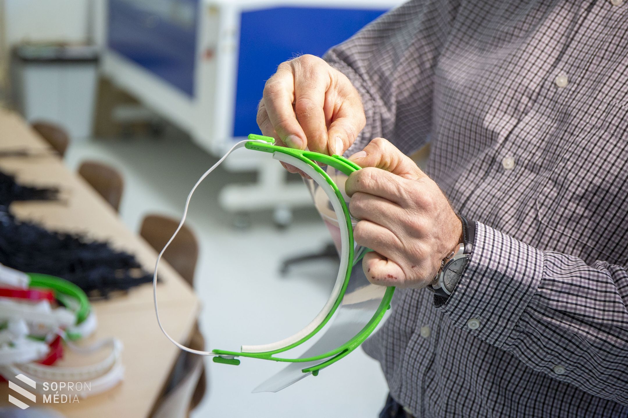 - A kezdeményezés a székesfehérvári centrumtól indult, ugyanis a városuk kórháza megkereste az intézményt, hiszen az intenzív ellátásnál nagy szükség van a plexi arcvédő álarcra – emelte ki Králik Tibor, a Soproni Szakképzési Centrum kancellárja. - Ehhez elkészült egy szoftver, amelyet a Digitális Közösségi Alkotóműhelyünkben mi is tudunk alkalmazni, hiszen itt található 3D-s nyomtató. Ezért gyorsan elkezdtük megteremteni a feltételeket. Dr. Taschner Róbert, a műhely vezetője pillanatok alatt összeszedte a kollégáit és hamar el is tudtuk kezdeni gyártani ezeket a fontos eszközöket. A Soproni Gyógyközpontnak már 50 darabot át tudtunk adni, de fog kapni a kapuvári és a csornai kórház is – osztotta meg velünk.