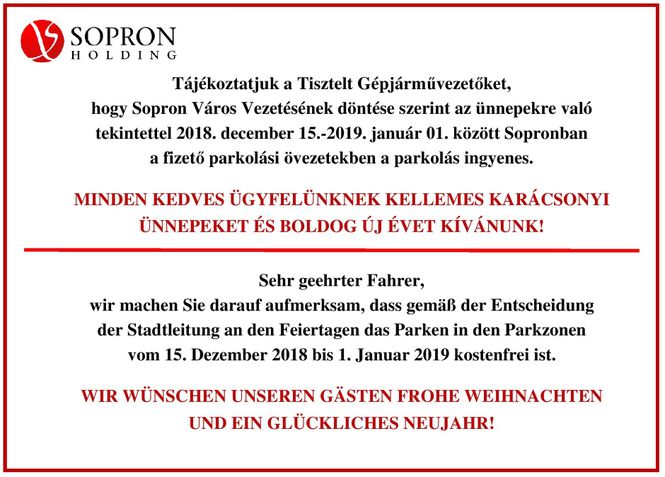 2018. december 15-e, szombattól egészen január 1-je keddig Sopron valamennyi övezetben ingyenesen lehet majd parkolni.