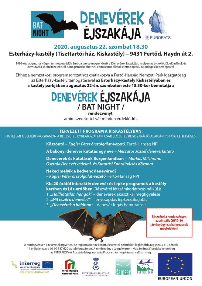 Az augusztus 22-i esemény este fél hétkor kezdődik a Kiskastélyban, majd a program a kastély parkjában folytatódik. 1996 óta augusztus végén természetvédők Európa-szerte megrendezik a Denevérek éjszakáját, ahol előadások és bemutatók során ismertetik meg e titokzatos állatok életmódját és különleges képességeit a látogatókkal.