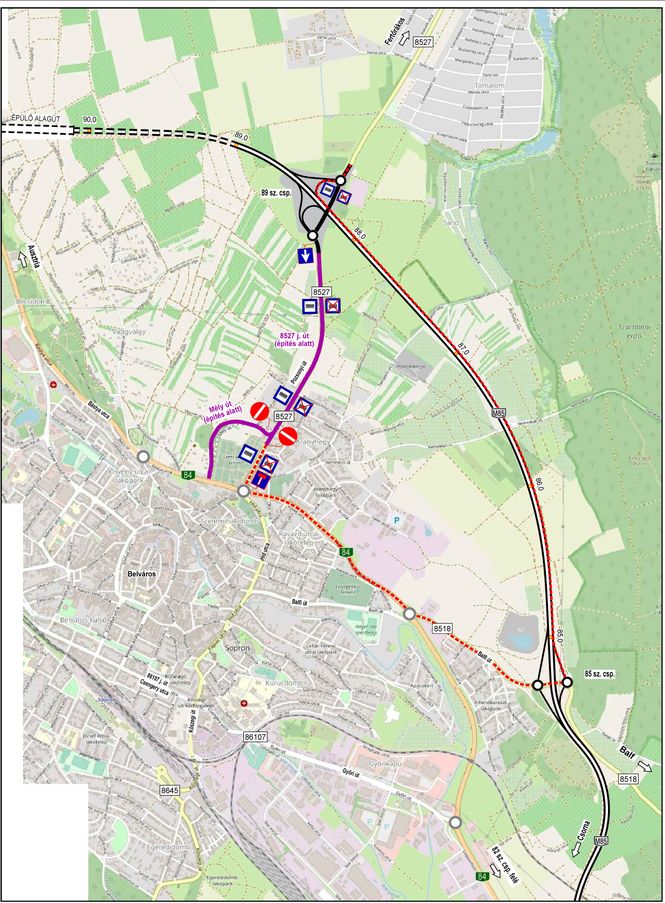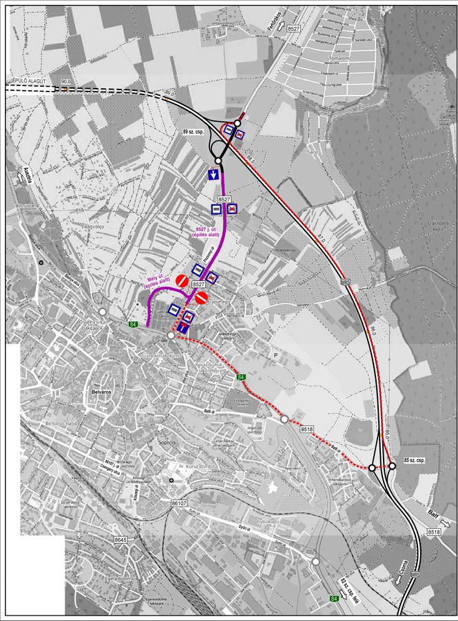 A Sopronból Fertőrákos irányába haladó forgalom számára pedig terelőutat jelöltek ki az új balfi csomópont és az M85 még át nem adott szakaszán keresztül. A gyorsforgalmin haladó terelésen 60 km/h sebességkorlátozás mellett, egy sávon lehet majd közlekedni.
