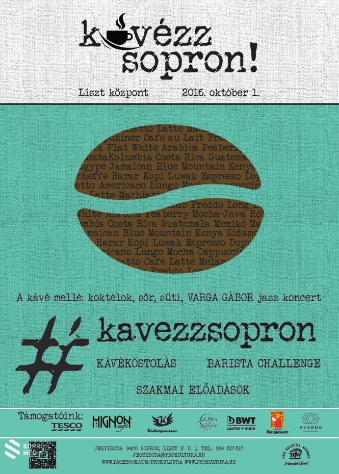 A Kávézz Sopron! című rendezvény 9 órakor nyitja kapuit. A Liszt központ második emeletén 17 kiállítónál lehet kóstolni és vásárolni, nem csak kávét, hanem csokoládét, süteményt, kávés koktélt és sört is. A Petőfi terem ad helyet a 8 szakmai előadásnak, melyek óránkénti váltással, 10-től 19 óráig zajlanak. Az előadásokon kávéval vagy ahhoz kapcsolódó különlegességekkel foglalkozó szakemberek osztják meg tapasztalataikat a közönséggel.