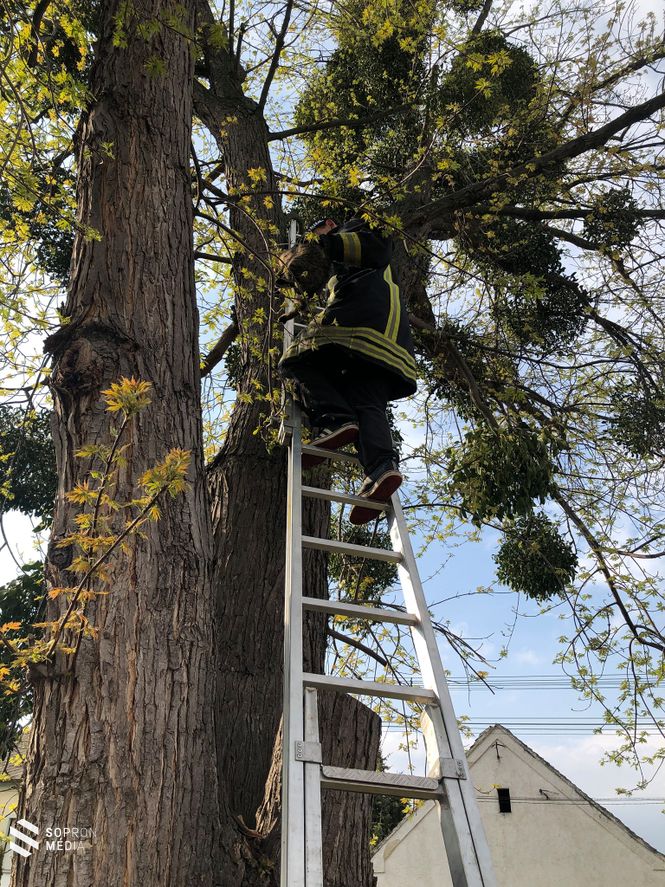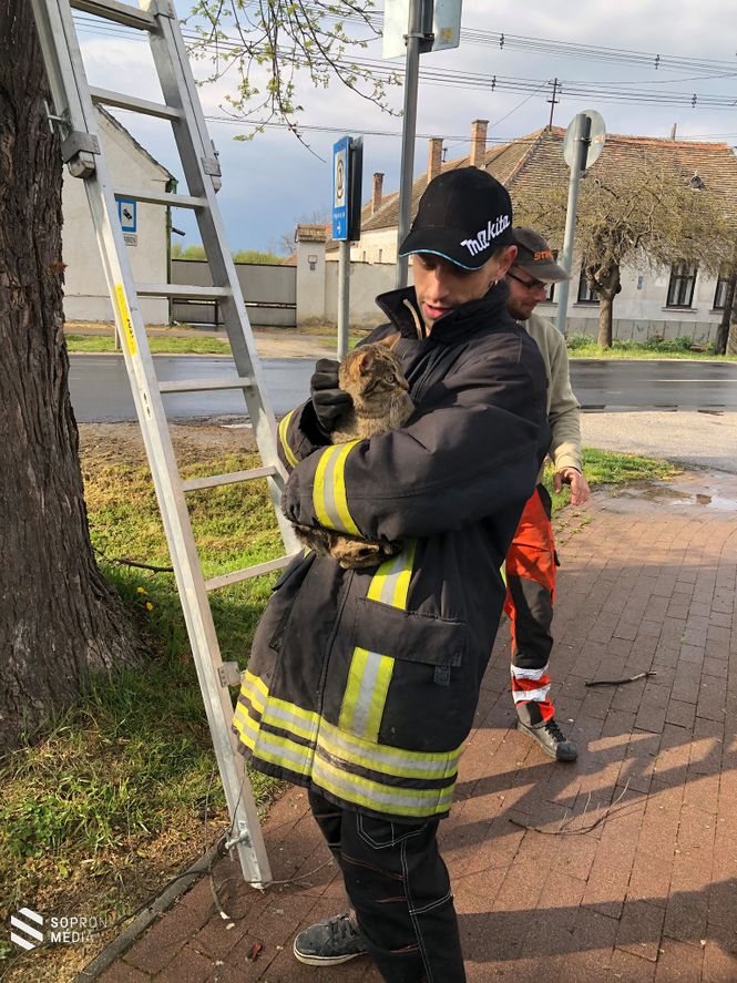 A hegykői önkéntes tűzoltókhoz szerdán délután érkezett a bejelentés, hogy egy bajba jutott macska keserves nyávogása hallatszik egy fa tetejéről. Az állat reggel óta ugyanazon az ágon volt, és nem tudott lejönni.