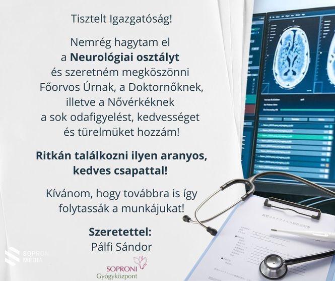 A Soproni Gyógyközpont számára mindig öröm, amikor a betegek vagy a hozzátartozók megosztják az ellátásuk során szerzett tapasztalataikat. Pálfi Sándor megható levélben köszönte meg a Neurológia – Stroke Osztály orvosainak és nővéreinek elhivatottságát és empatikus hozzáállását.