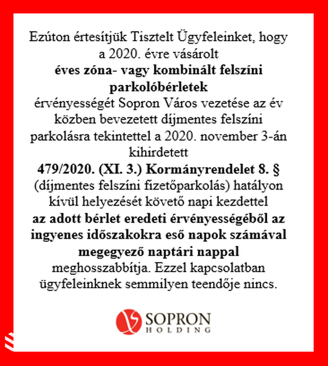 A Sopron Holding közösségi oldalán megjelent tájékoztatása szerint a 2020. április 6-tól már érvényes felszíni éves parkolóbérletek érvényessége 145 naptári nappal hosszabbodik meg, míg a 2020. július 2. és november 3. közötti érvényességi kezdetű bérletek érvényessége 58 naptári nappal lesz hosszabb.