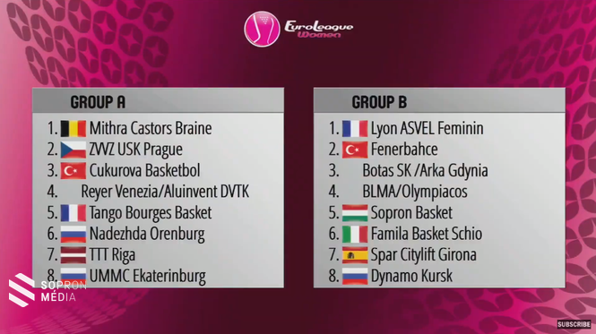 B csoport: Dynamo Kursk (orosz), Fenerbahce SK (török), Sopron Basket, Famila Schio Basket (olasz), Spar Citylift Girona (spanyol), Lyon ASVEL Feminin (olasz), Botas SK (török) / Arka Gdynia (lengyel), BLMA (francia) / Olympiacos (görög)