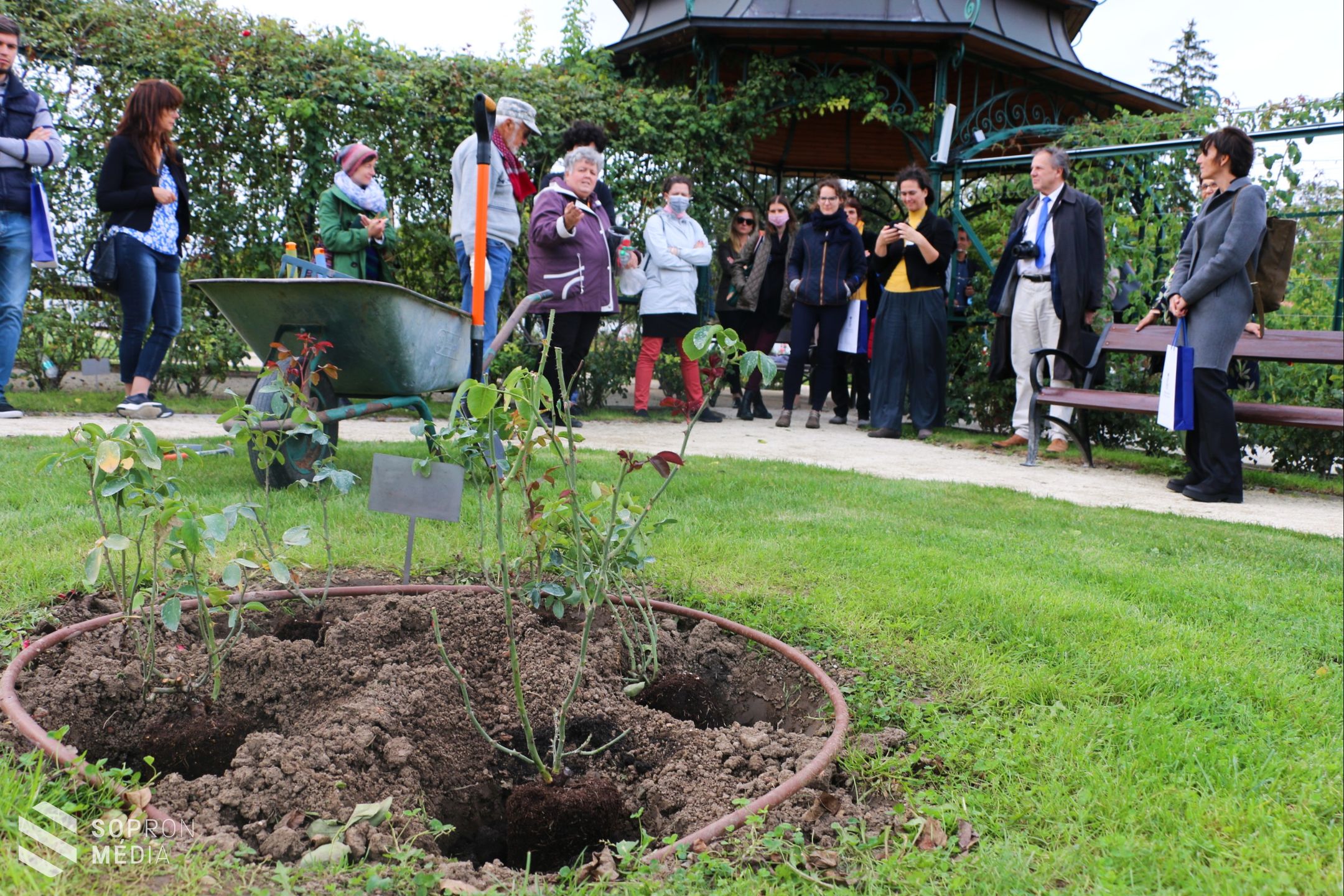 A Mőcsényi Mihály Kertművészeti és Kerttörténeti Műhely konferenciájának résztvevői a világszerte elismert kertészmérnök nevét viselő ágyásba 12 tő Satchmo rózsát ültettek el, amely egy sokvirágú, téglapiros fajta.