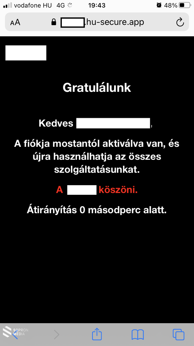 - A Magyar Posta vagy más csomagküldő szolgálat nevében e-mailben, vagy sms-ben küldött - általában a szállítási cím egyeztetésére és/vagy a díj kifizetésére - linknek se dőljenek be! A levélben látható „Kattints ide", „Fizessen online" vagy „Küldje el nekem a csomagot" illetve hasonló feliratú linkek adathalász weboldalakra továbbítanak, ezért ezekre semmiképpen se kattintsanak!