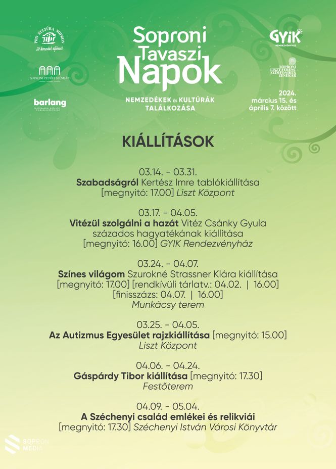 Az idei Soproni Tavaszi Napok igazi városi kulturális ünnep az együttműködés, az intézmények és a közösségek erejével, összefogásával, hiszen a Pro Kultúra partnerei a majd egy hónapig tartó nagyszabású, műfajilag sokszínű, minden generációt megszólító, a települést megmozgató rendezvénysorozat keretében a Soproni Múzeum, a Soproni Széchenyi István Városi Könyvtár és Sopron Megyei Jogú Város Polgármesteri Hivatalának Sportfelügyeleti Csoportja.