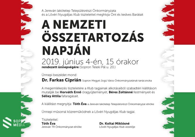 Idén immár második alkalommal emlékeznek meg a Nemzeti Összetartozás Napjáról a Jereván lakótelepen is, ahol 15 órakor a Teleki Pál u. 20. előtti téren a Lővéri Nyugdíjas Klub és Jereván lakótelep Településrészi Önkormányzat közös szervezésében kiállítás is nyílik.