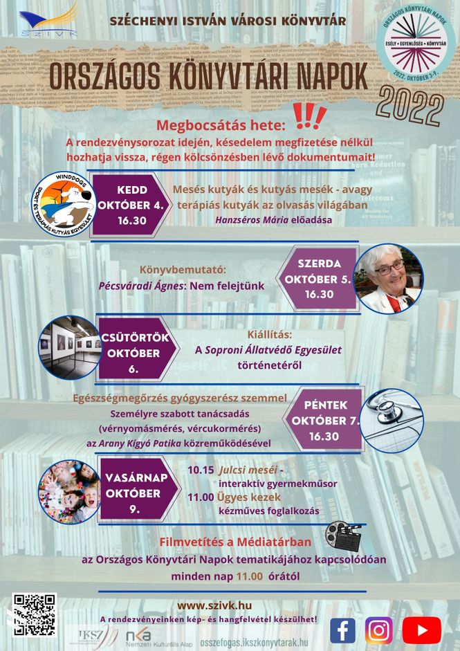 Október 4. és október 9. között a Soproni Széchenyi István Városi Könyvtár is csatlakozik az Országos Könyvtári Napok rendezvénysorozathoz. Számos színes programmal és előadással várják az érdeklődőket. Ezen a héten a késedelmes könyveket is büntetlenül lehet visszavinni a könyvtárba.