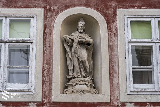 Eláruljuk: a Bécsi-külvárosban, a Halász utca elején járunk. Szent Miklós szobra az utca vonalának törésénél, a 3-as számú, egyszerűségében megragadó, pirosas vakolású egyemeletes középkori ház emeleti ablakai között helyezkedik el. A védett műemlék épület táblájának tanúsága szerint a ház „gótikus homlokzatú része 1485-87. között épült javadalmas papi lakóháznak. A XVI. és XVIII. században bővítették.” Helyreállítása 1969-72. között történt meg, ma lakóházként működik. A keskeny homlokzatú ház kőkeretes ablakai között az emeleten félköríves fülkében párnaszerű talapzaton áll a szobor. Lábánál felirat nélküli medalion. Jobb keze mintha sérült volna, elképzelhető, hogy eredetileg püspöki botot tartott benne, ahogy gyakran ábrázolják őt. Bal kezében a szent szokásos jelképeit tartja: könyvet és három almát fog magához. Ruházata püspöki öltözék.
