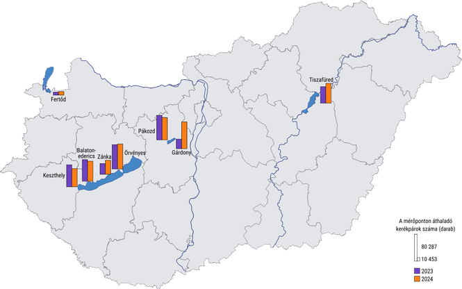 A Magyar Közút Zrt. által működtetett kerékpárforgalmat mérő műszerek adatait felhasználva 2024. június, július és augusztus hónapokban a magyarországi nagy tavaknál összességében 13,2%-kal nőtt a kerékpárforgalom (1. ábra). A nyári hónapokban a vizsgált településeken 447,6 ezer kerékpáros elhaladását becsültük, szemben az előző évi 395,6 ezerhez képest. Tiszafüreden, a Tisza-tó mellett 2023. nyári hónapjaihoz viszonyítva, 20%-kal növekedett a mérőpontokon áthaladó kerékpárosok száma. A Velencei-tó mellett Pákozdon 9,1%-kal csökkent a kerékpárforgalom, míg Gárdonynál közel megháromszorozódott, 2,8-szeresére emelkedett.