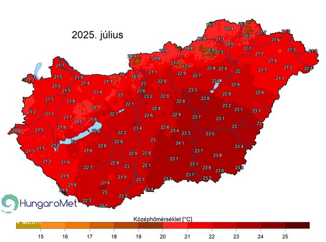 Hozzátették: az Alföld középső és déli részén nagy területen 23 fok felett alakult a hónap középhőmérséklete. Az ország többi részén általában 21 és 23 fok között volt a júliusi átlaghőmérséklet, 20 fok alatti értékek csak hegyvidéki területeken fordultak elő.