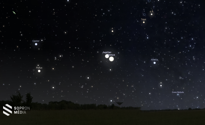 A Jupiter és a Vénusz párosát kedden hajnali 3 óra után érdemes keresni északkelet felé. A Jupiter lesz magasabban az égen, a Vénusz pedig alacsonyabban, jobbra. Mivel mindkét bolygó ragyogóan fényes az éjszakai égbolton, ezért akár a napkeltét követően is követni lehet majd a párost a hajnali égen.