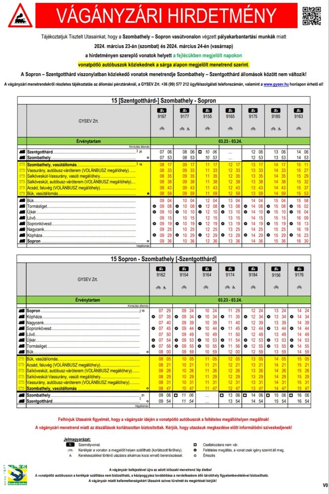 A Sopron – Szombathely vasútvonalon végzett pályakarbantartási munkák miatt egyes vonatok 2024. március 23-tól (szombat) 2024. március 24-ig (vasárnap) Sopron és Bük állomások között módosított menetrend szerint közlekednek, valamint az érintett vonatok helyett Bük és Szombathely állomások között vonatpótló autóbuszok szállítják az utasokat.