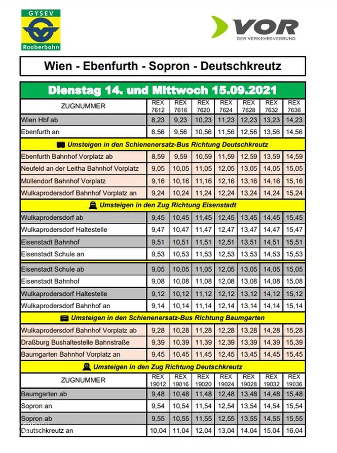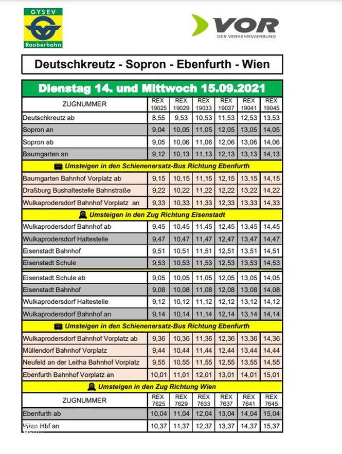 Pályakarbantartási munkálatok miatt szeptember 14-én és szeptember 15-én napközben a Deutschkreutz – Sopron – Ebenfurth – Wien vonalon vágányzári menetrend lesz érvényben, valamint Baumgarten és Ebenfurth között vonatpótló autóbuszok szállítják az utasokat.
