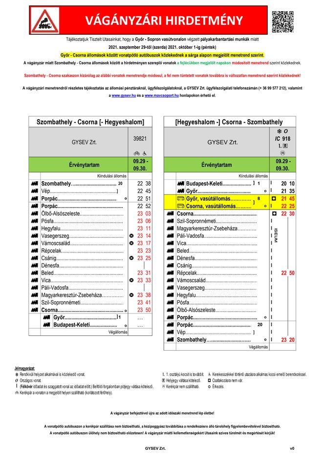 A Sopron–Győr vasútvonalon végzett pályakarbantartási munkálatok miatt 2021. szeptember 29-től 2021. október 1-ig Csorna és Győr állomások között egyes vonatok helyett vonatpótló autóbuszok közlekednek. A vágányzár miatt Szombathely–Csorna állomások között is változik egyes vonatok menetrendje.