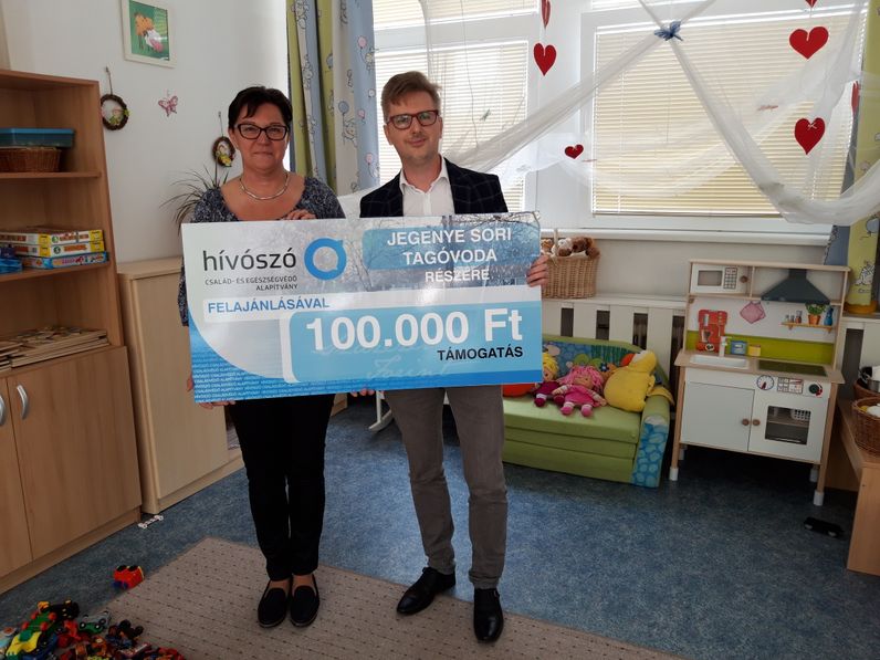 Gyermeknap alkalmából 100 000 Ft készpénz adománnyal lepte meg Lagler András, a Hívószó Családvédő Alapítvány elnöke az idén negyvenedik születésnapját ünneplő Jegenye Sori Tagóvodát.